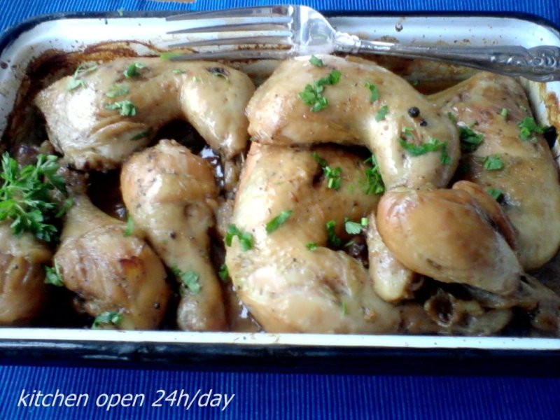 Se spala pulpele si se curata, apoi se condimenteaza cu sare, piper si cimbru. Se taie ceapa si usturoiul si se calesc in putin ulei. Se adauga pulpele si se lasa sa se rumeneasca un pic. Se adauga berea si se lasa la fiert, pana ce carnea este bine patrunsa. Se scot pulpele si se aseaza intr-o tava de friptura, dreptunghiulara, se toarna si lichidul peste pulpe. Se pune tava la cuptor si se lasa pana cand scade berea si carnea este rumenita usor. Se mai intorc pulpele din cand in cand, ca sa se rumeneasca pe ambele parti.