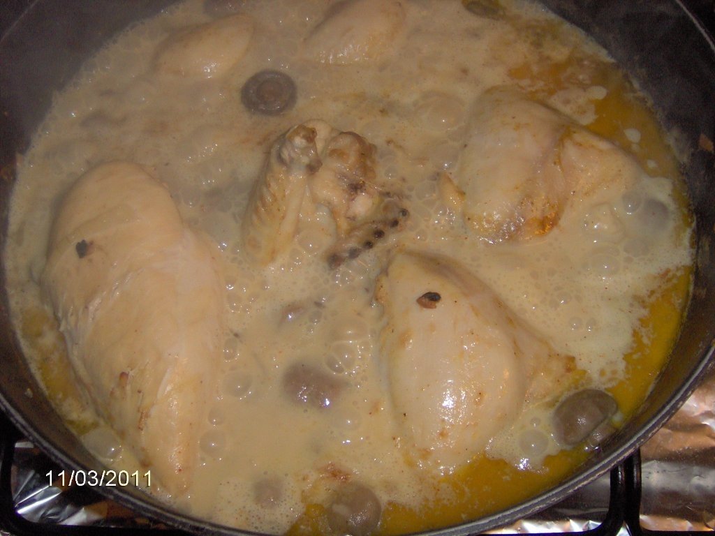 Intr-o tigaie cu fundul dublu si se potriveste si la cuptor incalzim putin ulei si prajim usor ceapa adaugam usturoiul taiat felii si il prajim putin dupa care adaugam bucatile de pasare si le prajim putin pe toate partile. Adaugam putina apa si lasam sa inceapa sa fiarba. Adaugam ardeiul iute bucatele mici si ciupercile intregi netaiate. Adaugam coriandu macinat, putin coriandru, sare si piper la nevoie. Adaugam laptele de cocos si 1-2 linguri praf de sups cu gust de ciuperci. Amestecam totul bine si punem cratita acoperita cu aluminium la cuptor. Cuptorul incalzit dinainte la 180 de grade. Lasam mincarea la cuptor 45-50 de minute pina carnea este moale si sosul mai concetrat. Daca este prea mult sos se poate lasa citeva minute pe gaz ca sosul sa mai scada. Este minunata cu mamaliga calda sau cu orez alb fiert.