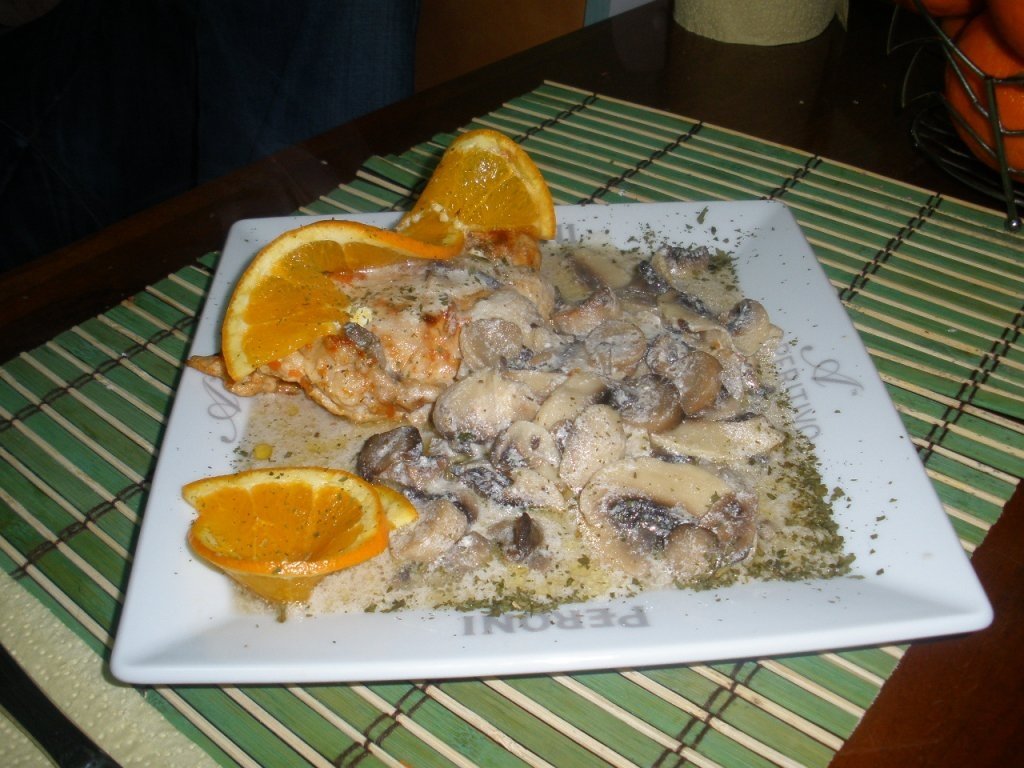 Se stoarce sucul de la portocala si cel de la lamaie si se pune pieptul de pui la macerat,condimentandu-se cu sare,piper si curry.Peste o ora il punem la prajit.Intr-o alta tigaie se pun ciupercile la prajit.Cand si acestea sunt gata se toarna peste smantana(deja amestecata cu vegeta) si se adauga si un cub knorr cu gust de ciuperci.Se mai lasa 10 min timp in care mestecam.Cand carnea este gata se aseaza pe farfurie si se garniseste cu ciupercile.Se presara patrunjel.