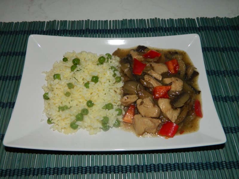 Pui cu ciuperci si sos de soia cu garnitura de orez alb. O ceapa curatata si taiata in bucati mari se pune la calit in putin ulei cu pieptul de pui taiat si el in bucati, pana cand ceapa si carnea se inmoaie.