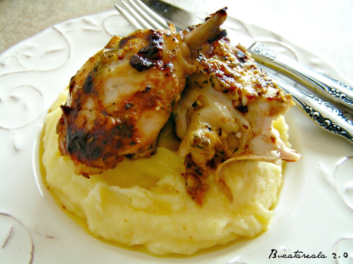 La final se lasa puiul sa se odihneasca cam 5 minute, dupa care se portioneaza si se serveste. Noi i-am urmat sfatul dlui Pepin si am facut un pufos si delicios piure de cartofi, imbogatit prin adaugarea la fierbere, impreuna cu cartofii, a doi catei de usturoi, pe care i-am si pasat impreuna cu acestia. Gustul de usturoi este foarte subtil, aproape ca nu se simte, dar este parca usor mai fin.