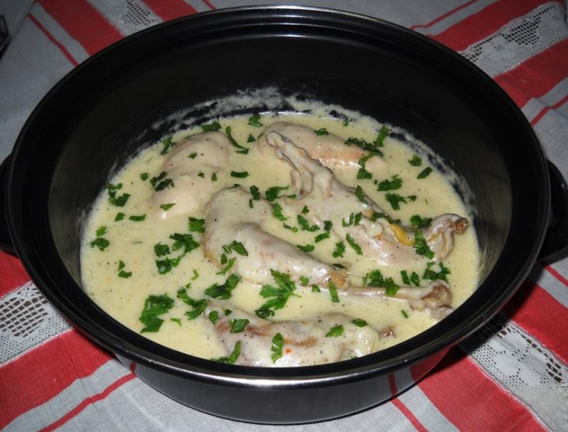 Ceapa se taie marunt si se caleste separat, în ulei.Cand se inmoaie putin adaugam faina si amestecam bine.Lasam un minut doua si adaugam smantana.Amestecam ,lasam sa dea cateva clocote si diluam cu supa in care a fiert puiul . Adaugam bucatile de carne si lasam sa fiarba cu totul cam 10 minute. Daca mai este nevoie, mai adaugm supa pana obtinem consistenta dorita.Condimentam cu sare si piper iar la sfarsit adaugam patrunjel tocat. Pofta buna!