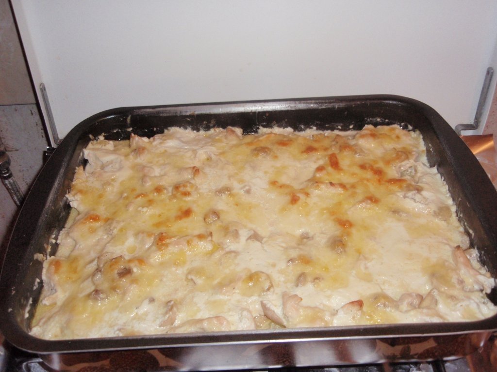 Se curata cartofii, se taie rondele si se fierb 5 minute. Pieptul de pui se taie fasii si se caleste in 2 linguri de ulei. Separat se calesc ciupercile (taiate felii) si usturoiul. Cand se inmoaie ciupercile se adauga pieptul de pui si se stinge cu vin alb.Cand jumatate din cantitatea de vin s-a evaporat se adauga smantana dulce, parmezanul si se condimenteaza cu sare si piper.Se fierbe pana cand se ingroasa sosul.Se aseaza cartofii in tava si se toarna deasupra sosul.Se presara cascaval sau mozzarella si se da la cuptor 40 de minute sau pana se rumeneste.