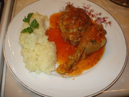 Se pune putina apa peste pulpe si se introduce tava la cuptor pana se rumenesc pulpele.Cand sunt gata rumenite se adauga bulionul si apa daca mai este nevoie si se mai lasa inca un sfert de ora la cuptor.Se poate servi cu orez fiert.