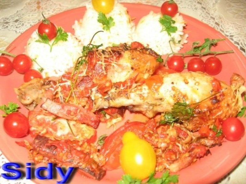 Pulpele cu kaizerul se pun intr-o tigaie wok cu foarte putin ulei si se calesc 10 minute.Adaugam apoi usturoiul, rozmarinul, foile de dafin si rosioarele si mai lasam sa se caleasca 15 minute. Daca rosioarele nu lasa destul de mult lichid , adaugam 1/2 pahar supa de carne.Lasam sa se caleasca acoperit apoi se pun pulpele intr-un vas termorezistent uns cu unt, impreuna cu kaizerul si rosioarele. Deasupra punem rosiile taiate felii mai groase si se poate rade si putin cascaval.