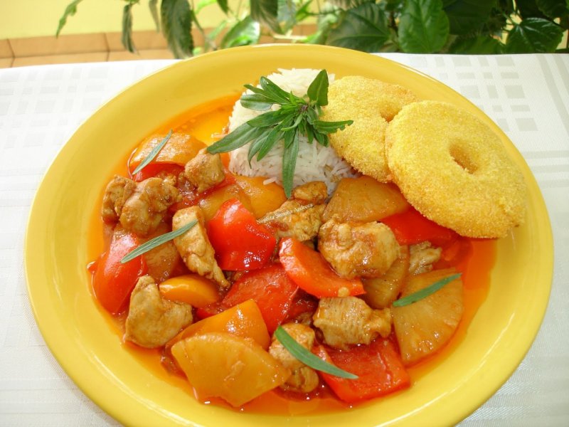 Este una dintre cele mai populare retete chinezesti.Se face un amestec din zahar, otet, pasta de tomate si sucul de ananas. Se taie cateva felii subtiri de ghimbir proaspat, ardeiul cuburi potrivite iar puiul fasii sau cubulete. Se condimenteaza bine carnea de pui cu piper, curry, alte condimente pentru pui si sos de soia. Se « maseaza » bine si se tine la frigider pentru cel putin 30 de minute. Se incinge niste ulei intr-un wok, se caleste ghimbirul apoi se adauga ardeiul gras si la sfarsit carnea. Dupa calirea acestora se adauga ananasul taiat sferturi si dupa cateva minute sosul dulce acrisor. Se lasa pana scade si se formeaza un sos destul de gros. Se gusta si daca e cazul se mai adauga ce-i lipseste. Se bat cateva albusuri spuma si se dau 4 felii de ananas prin albus si malai apoi se prajesc putin. Se pune supa pe foc si cand clocoteste se adauga orezul spalat. Se acopera cu o folie de aluminiu si capac. Se lasa pe foc mic timp de 15 minute dupa care se ia capacul, se inchide focul si se mai lasa cu folia pentru 10 minute dupa care se inlatura. Se clatesc forme cu apa rece, se scurg si se umplu cu orezul. Dupa ce se mai raceste orezul se rastoarna bolul printr-o miscare brusca pe o farfurie intinsa. Se serveste puiul impreuna cu orezul si rondele de ananas. Cine doreste poate cali si putina ceapa si usturoi. De preferat a se gusta sosul acrisor inainte si dupa ce l-ati adaugat in wok sa nu fie aroma prea puternica pentru cei carora nu le plac gusturile acestea la mancaruri.