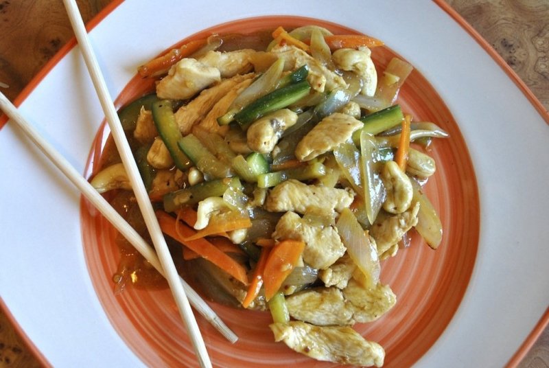 Faza 4 este combinarea ingredientelor și un continuu stir frying. Peste cele de mai jos, se pune din nou carnea de pui. Se adaugă acum morcovul tăiat, apoi castravetele. Se toarnă puțin sos de soia și supa de pui. Se drege sosul cu amidon (să nu iasă însă prea gros!). Se mai adaugă supă, dacă e cazul. În ultimă instanță, se aruncă în wok nucile de caju. Se pune sare după gust. Stinge focul și adaugă oțet și sos chilli.