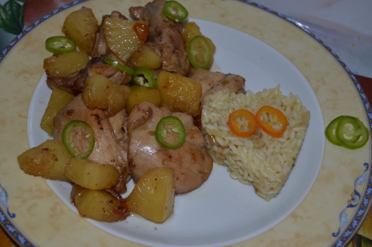 Se taie carnea in bucati, iar bucatelele de carne se pun in tigaie si se prajesc cateva minute la foc iute. Adaugam o ceapa taiata in bucati mari, ardeiul iute taiat felii fine si lasam sa se patrunda ceapa bine, apoi adaugam bucatile de ananas, mierea, vegeta si siropul de ananas. Cand siropul scade, adaugam soia, amestecam usor si oprim focul.