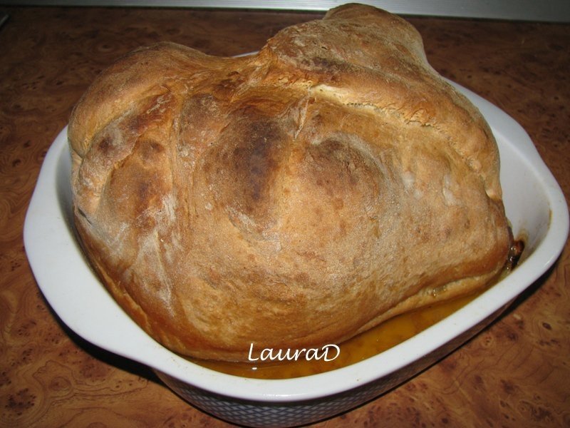 Pe o suprafata pudrata cu faina ruleaza aluatul pana cand ajunge la grosimea de 0,5 cm.Aseaza foaia de aluat in vasul termorezistent.Aseaza puiul peste aluat si imbraca-l in aluat.Da puiul la copt 1h 30 minute.Serveste puiul cu legume la cuptor.
