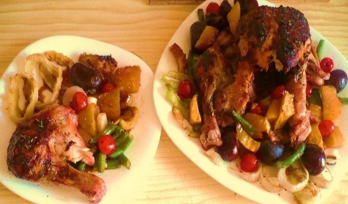 Servim puiul intreg pe un platou alaturi de teci de fasole verde, castanele coapte, ciresele de cocktail, inelele de ceapa crocante si cartoful dulce yam.