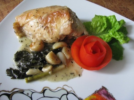 2. Se adauga, in tigaie, usturoiul, telina, rozmarinul si cimbrul si se calesc 1 minut.Se adauga vermutul/vinul alb.Se mareste focul, se dau in clocot si se fierb timp de 2 minute, pana se evapora alcoolul.Se adauga supa de pasare, sarea si piperul in tigaie si se dau din nou in clocot.Se ia tigaia de pe foc.Se pun legumele si sosul lor in tava cu carne.Tava se acopera cu folie si se lasa la cuptor timp de 45 minute, pana cand carnea de pui este gata, iar usturoiul a inceput sa se inmoaie.