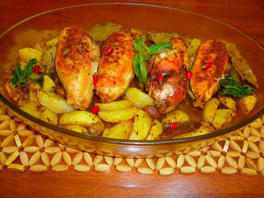 Cartofii se curata de coaja , se taie in jumatati si se presara cu un amestec de sare, condiment de pui si za’atar; se stropesc cu ulei de masline si se aseaza in tava langa pui ; se aseaza printre cartofi foile de dafin si maslinele verzi.