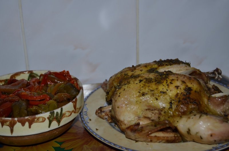 -Se spala bine puiul si se presoara din belsug cu ierburi aromate si sare,se introduce si in interiorul puiului ierburi aromate si sare.Se pune puiul in tava,il stropim apoi cu vin ,cu ulei ,punem capac peste vas si dam tava la cuptor la foc potrivit.Cand consideram ca puiul este facut luam capacul si lasam sa se rumeneasca un pic.