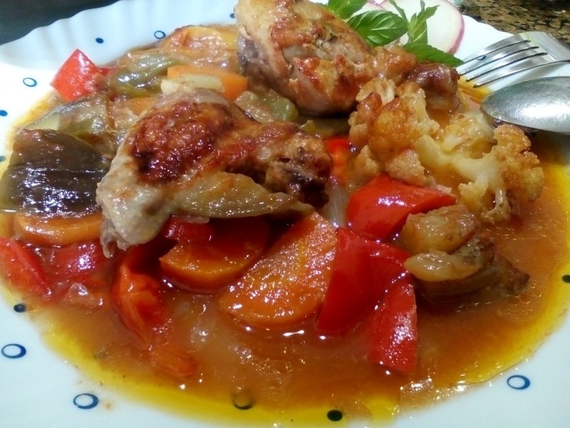 Mai întâi, am pus uleiul, ceapa, după care am adaugat toate celelalte legumele, care au fost în prealabil amestecate cu vegeta piper și sare după gust. La sfârșit am adăugat sucul de roșii amestecat cu pasta de tomate și deasupra am pus carnea de pui. După ce tava a fost pregătită, am dat-o la cuptorul preîncălzit la temperatura de 200 de grade C, timp de o ora. Pe parcursul gatirii, putem sa deschidem cuptorul si sa verificam cantitatea de sos formata. Daca a scazut prea mult, mai putem adauga un pahar de apa in care am dizolvat o ligura de pasta de tomate. După o ora, rumenim puțin si suprafata, apoi oprim focul. Mancarea obtinuta se servește calda sau rece cu pâine, cu ardei iute, murături, ridichi, masline sau cu ce alceva doriți. Este o mâncare foarte gustoasa, sănătoasă și bogată în vitamine, fibre și minerale. Nu mai zic de aspectul ei minunat. Încă suntem în sezon, așa ca, ați putea încerca si voi, aceasta rețeta rapida care nu necesita nici prea mult timp si nici oboseala.