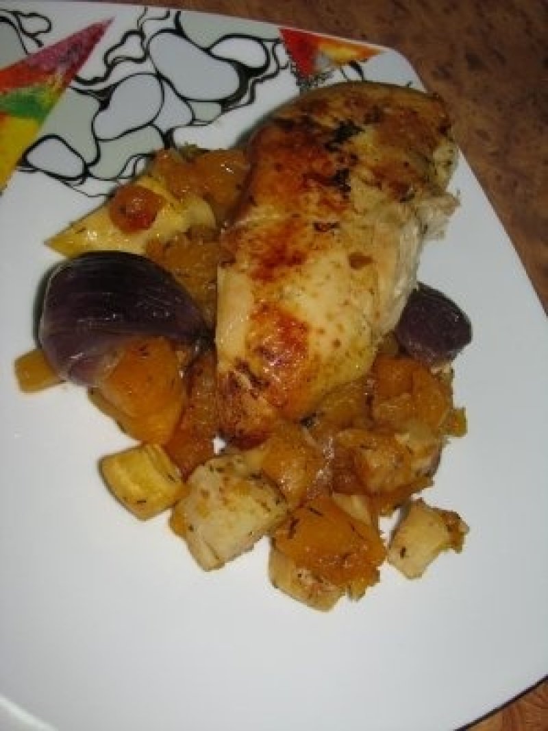 1.Se incinge cuptorul la 180ᵒC.2.Intr-o tava se pun legumele, cimbrul, sarea, piperul si uleiul de masline.Se aseaza puiul pe patul de legume, cu pieptul in sus.Se condimenteaza cu paprika.3.Se coc 1 ora, amestecand legumele din cand in cand.Se toarna mierea peste legume si se mai lasa la copt 15-20 minute, pana cand puiul s-a rumenit, iar legumele s-au inmuiat, apoi se serveste.