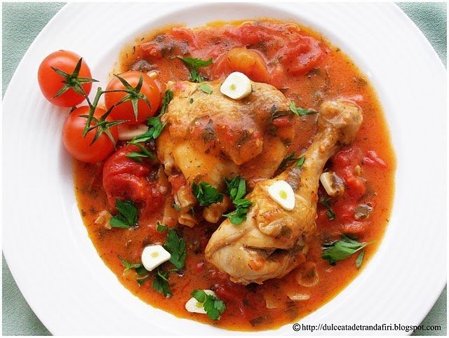 Zilele trecute, intr-un context ce includea si fasolea verde, o prietena mi-a spus ca nu-i place ceapa calita. Nu am aprofundat cat sa aflu in ce masura problema mai acuta se referea la ceapa sau la aceasta fiind calita insa asa mi-a venit ideea de a face un alt soi de ostropel, mai exact pui cu rosii intregi, sos si usturoi.