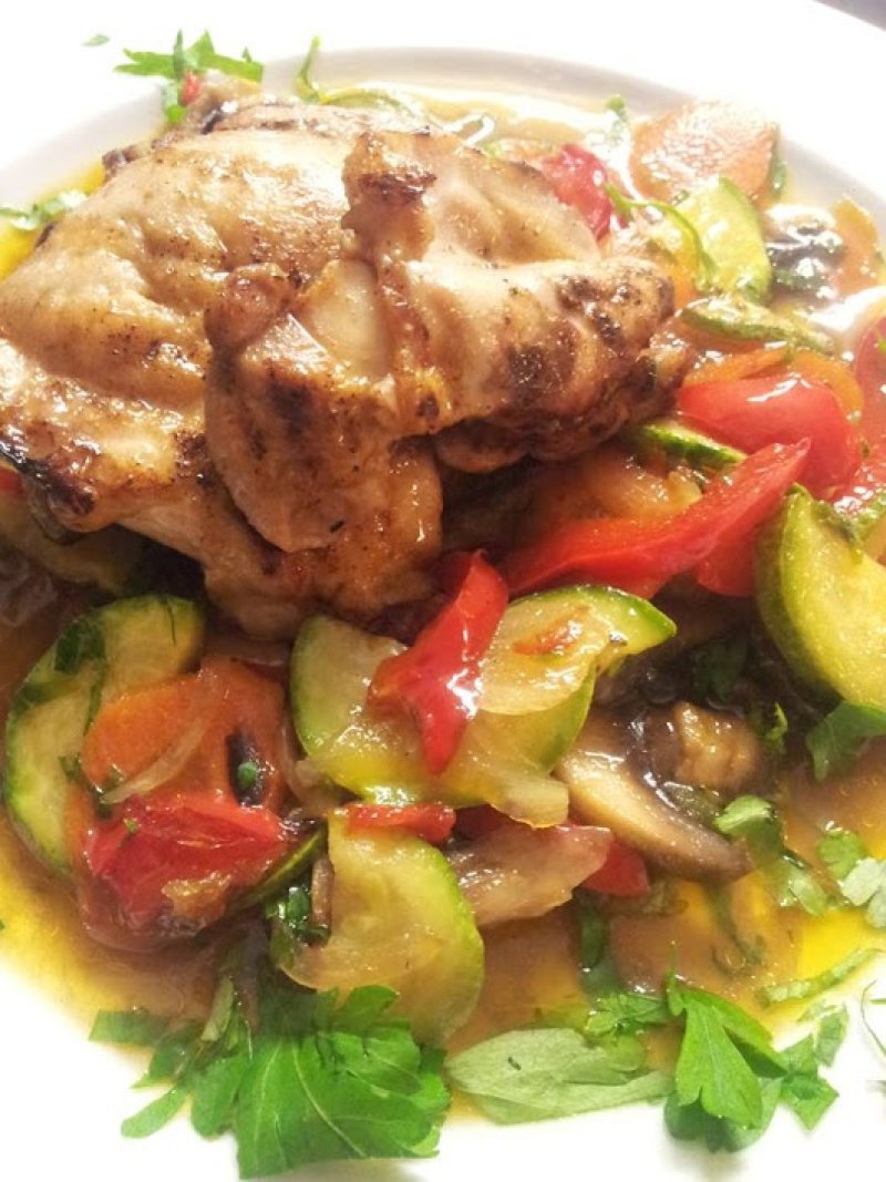 Puiul se taie bucati si se fierbe in supa ramasa de la legume. Se scoate din supa si asaza in alta tava cu ulei si si condimente si se rumeste la cuptor.