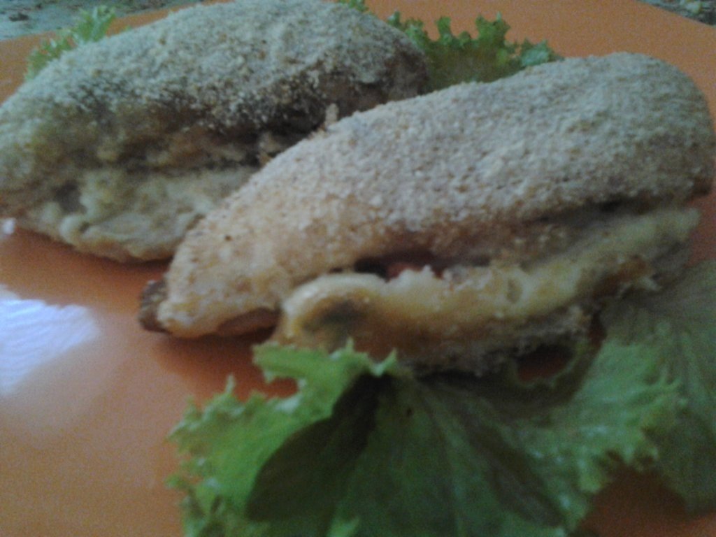 Se taie pieptul de pui in doua dupa care se asezoneaza cu sare si piper. Se fac doua "buzunare" in pieptul de pui, loc in care se pun cate o felie de mozarella si una de rosie, apoi se dau prin ou si pesmet si se pun in tava aragazului, pe hartie de copt, la cuptor pana cand se rumenesc frumos.