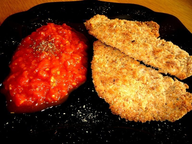 Batem pieptul de pui ca pentru snitele pana devin subtiri. Pregatim o farfurie cu faina, una cu un ou amestecat cu putina apa si alta cu amestecul de paine. Trecem bucatile de pui prin faina, apoi prin ou si in final prin amestecul de paine.