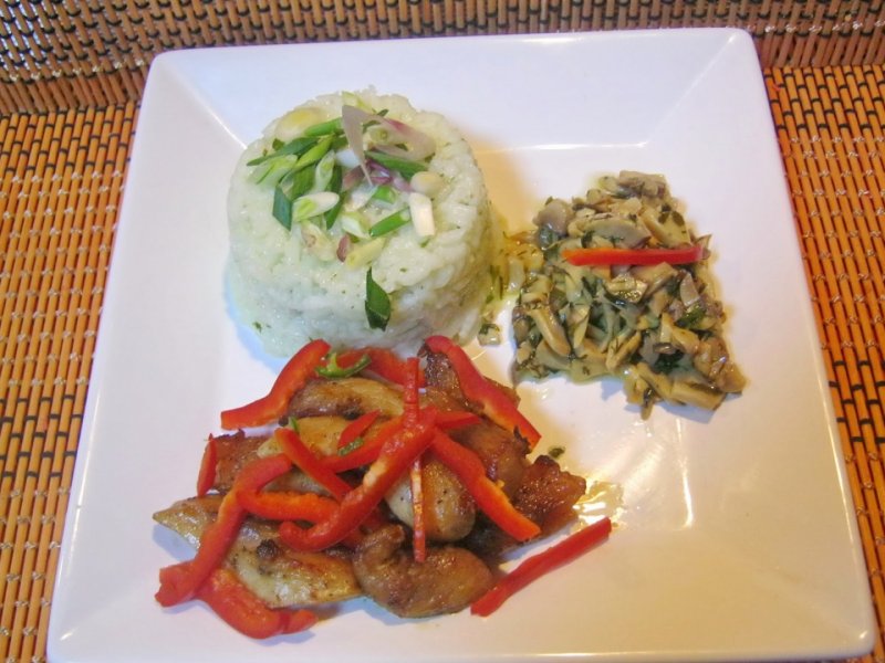 Punem orez, ciuperci, carne rumenita si le acoperin cu ardeiul taiat si ceapa taiata. Deasupra carni , punem 2-3 lingurite din sosul de lamaie.