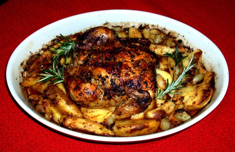 Se unge tava cu ulei de masline si se aseaza cartofii si arpagicul condimentate, peste care se pune puiul.