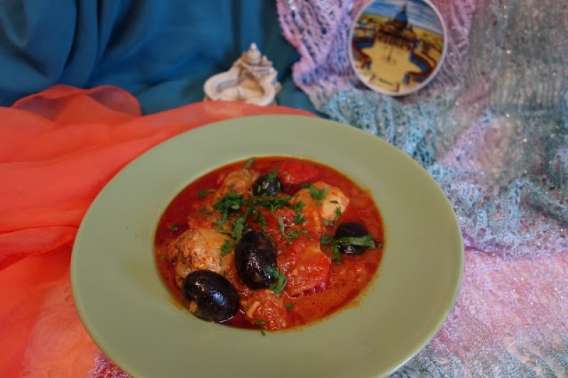 In uleiul ramas, punem ceapa si, cand este calita, adaugam rosiile taiate in jumatate, pasta de tomate si supa de pui sau vinul. Asezonam cu sare si piper si lasam vasul acoperit sa fiarba. Cand rosiile s-au inmuiat si sosul a inceput sa se ingroase, adaugam caperele, maslinele si carnea de pui. Mai lasam cam 10 min sa fiarba totul. Carnea trebuie sa fie fiarta bine. La servire, presaram busuioc proaspat tocat.