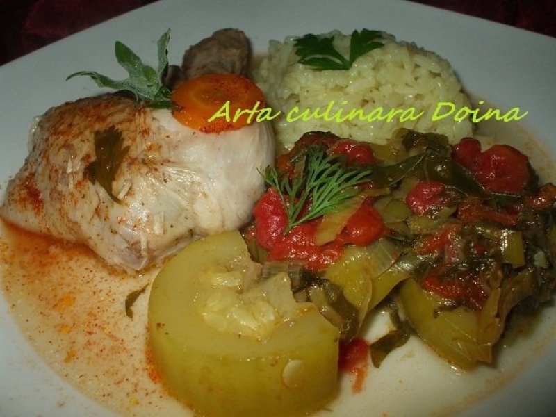 Acum este sezonul dovleceilor si sunt foarte gustosi in tot felul de combinatii: friganele, ghiveci, țușpais, pane, in salata de vinete. etc. Acum am facut țușpais cu pui rasol si garnitura de orez.
