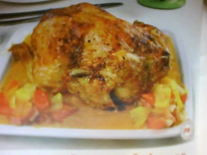 Cureti ardeii grasi si ii tai in bucati mari.Cureti ceapa si o tai cubulete,la fel ca si costita,apoi incingi uleiul si calesti ceapa impreuna cu costita.Adaugi si ardeii.Condimentezi cu sare si piper si mai lasi totul la calit timp de 5 minute,lasand ardeii sa fiarba in suc propriu.Freci puiul cu piper,sare,oregano si cu boia,pe dinauntru si dinafaraUmpli apoi puiul cu compozitia de legume,iar deschizatura o inchizi cu scobitori.Incalzesti cuptorul,asezi puiul in tava si-l lasi sa se coaca circa 50 de minute.Dupa prmele 30 de minute,intorci puiul pe partea cealalta.Adaugi la sos 125 ml de apa si legi sosul cu amidon,apoi adaugi bulionul si smantana.Cand e gata,scoti puiul si il asezi pe un platou.Torni sos de jur-imprejurul puiului si asezi si gramajoare de ardei gras,combinat cu costita.