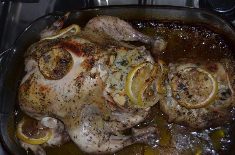 -Se pune puiul in tava,se presoara peste el putina sare, oregano, vin rosu si putin ulei. Se orneaza cu felii de lamaie, se pune capac la vas si se da la cuptor, la foc potrivit. Cand incepe sa se rumeneasca, se ia capacul si se mai lasa la cuptor,pret de cateva minute, apoi se opreste focul. Sa aveti pofta, dragilor!