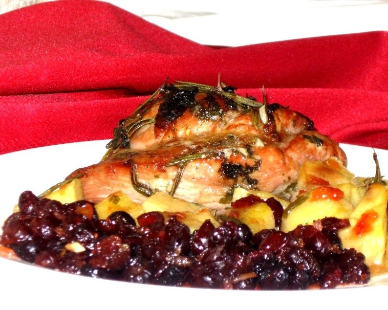 In timp ce carnea este la cuptor ne ocupam de sosul de merisoare.Punem toate ingredientele intr-o craticioara si lasam sa fiarba la foc potrivit ,avand grija sa amestecam din cand in cand,pana cand sosul se ingroasa.Mai adaugam apa si lasam sa fiarba incontinuare pana cand obtinem un sos gros si legat.Lasam pe foc circa 10-15 min pana cand toate merisoarele sunt sparte.Trebuie mentionat ca merisoarele sunt acrisoare asa ca potrivim de zahar dupa gustul fiecaruia.Eu nu am mai adaugat zahar pentru ca mie imi place mai acrisor acest sos.