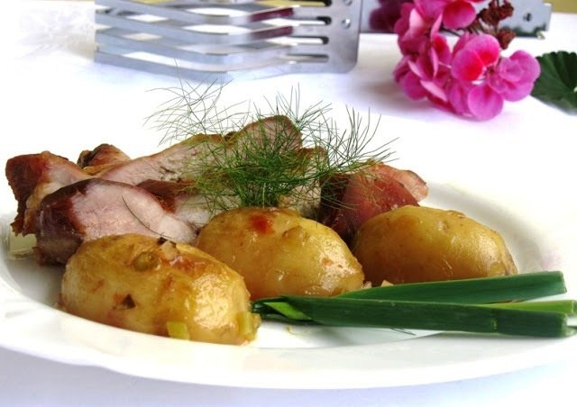 Cartofii se curata,se spala .......eu am folosit cartofi mai mici asa ca pe unii i-am lasat intregi si ce a fost mai maricei i-am taiat in doua.Asezam cartofii in vas alaturi de carne ,ii condimentam si pe ei cu sare,piper si rosmarin si ii stropim cu ulei.Adaugam si restul de usturoi verde taiat , turnam vinul,putina apa si dam la cuptor.Din cand in cand stropim carnea si cartofii cu sosul din vas.