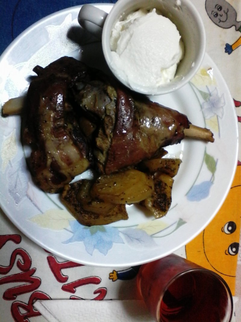 Spalam bine pulpa de iedut si o taiem. Curatam , spalam si taiem cartofii. Punem in tava de la aragaz putin ulei, sare, piper si oregano.Adaugam pulpa de iedut, cartofii , usturoiul taiat, sare, piper , oregano, restul de ulei si vinul rosu. Acoperim tava cu folie de aluminiu. Preincalzim cuptorul la 250 grade. Punem tava in cuptor si lasam 35 de minute la 250 de grade. Apoi scadem temperatura la 180 de grade si lasam aproape o ora. Intoarcem carnea dupa 30de minute si luam folia de aluminiu Servim cu iaurt