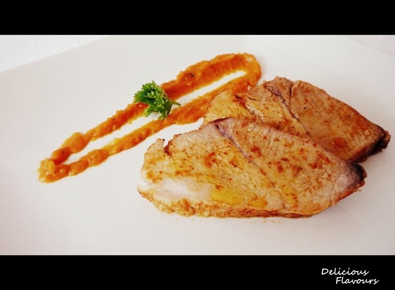 Servim feliile de pulpa de porc alaturi de sosul de legume si eventual garnitura de cartofi piure sau orez.