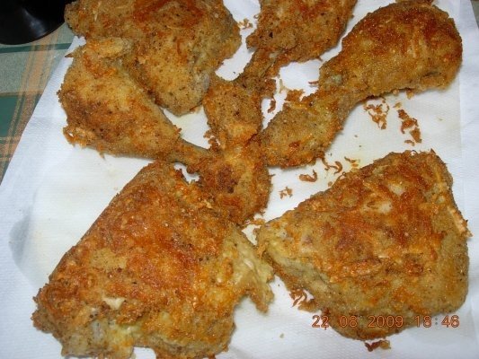 Se pun pulpele la fiert in apa cu putina sare.Se da cascavalul prin razatoarea cu gauri mici, se amesteca cu pesmetul si restul condimentelor. Separat intr-un bol, cu ajutorul unei furculite, se bat ouale. Dupa ce pulpele sunt fierte, se portioneaza (daca sunt intregi) si se trec prin faina, ou si amestecul de pesmet cu condiment. Se prajesc pe ambele parti, dupa care se scot pe un servet de hartie.