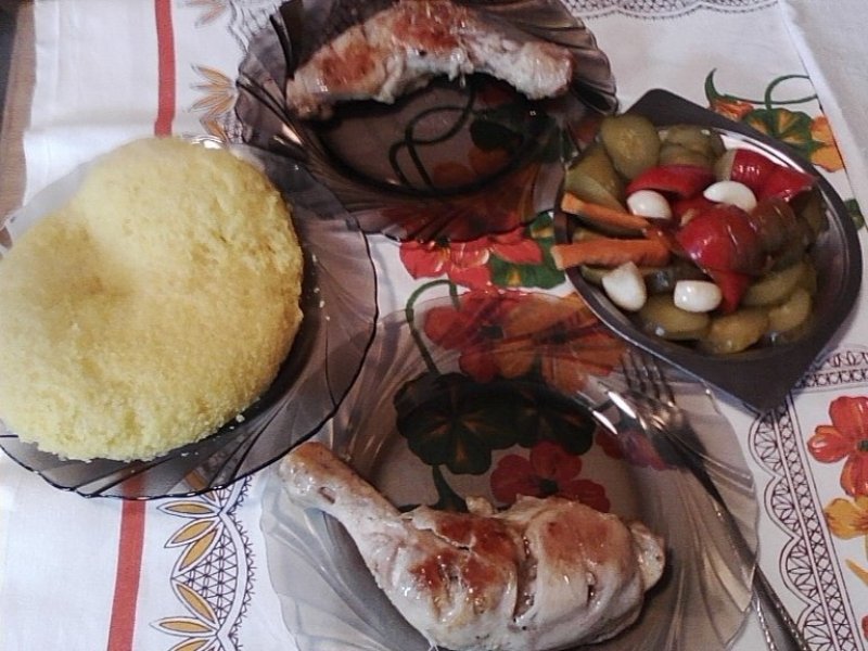 Crestez pulpele, le asez in tigaia incinsa unde am topit untul. Le las cate 2 minute pe fiecare parte, le condimentez,adaug usturoiul si apa. Acopar vasul, le intorc la 5-10 minute. Daca e nevoie mai adaug apa. Cand sunt aproape gata, adaug vinul, las sa scada sosul. Pulpele se rumenesc pe ambele parti (fara sa se prajeasca)Servim cu mamaliguta presarata cu branza de oi si muraturi asortate.