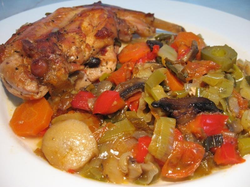 Ceea ce rezultă este o friptură de iepure cu o crustă rumenie deasupra şi o frăgezime de carne în interior.....plus o garnitură de legume aromată.