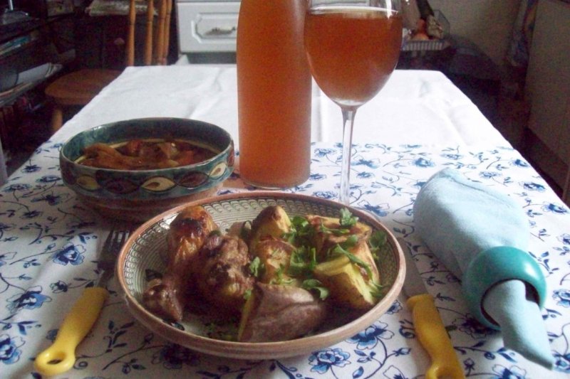 Ardei coacem pe gratar ii curatam de coarja si facem o salata cu 2 linguri de ulei, 2-3 linguri de otet si sare. Pulpele de pui amestecam cu oregano, putin ulei, sare si piper dupa gust si lasam sa stea o jumatate de ora. Cartofii cu coarja se spala bine, ii taiem in 4 si punem la fert in apa cu putina sare si lasam pana sunt jumatate ferti. Scurgem apa si cat timp lasam la racit cartofii, punem pulpele la gratarul aragazului electric si ii frigem pana se rumenesc bine dupa care le pastram intr-o tavita la cald. Cartofii ii punem intr-o tava unsa cu unt, presaram cu bucatele de unt pe deasupra cartofilor si daca mai trebuie punem si putina sare. Introducem tava la gratarul cuptorului si lasam sa se coaca pana prind o crusta. Se pune 2-3 pulpite in farfurie cu cartofi alaturi, presaram totul cu patrunjel maruntit si servim cu salata de ardei copti. Merge bine cum un vin rose demisec. Eu am servit un vin alb demisec de tara din zona Cotnari. Va urez pofta buna!