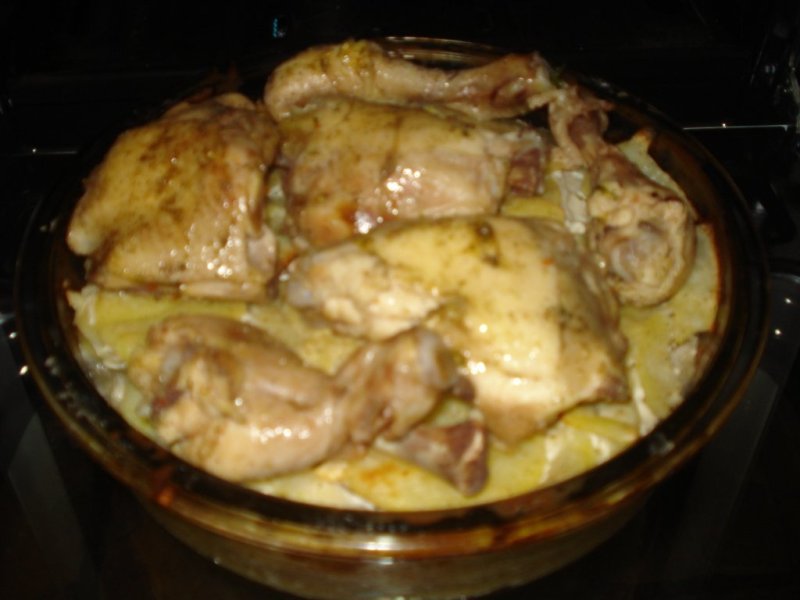 Pulpele se fierb in apa cu sare si in ultimele 10 minute se aseaza peste cartofi sa se rumeneasca si ele putin.