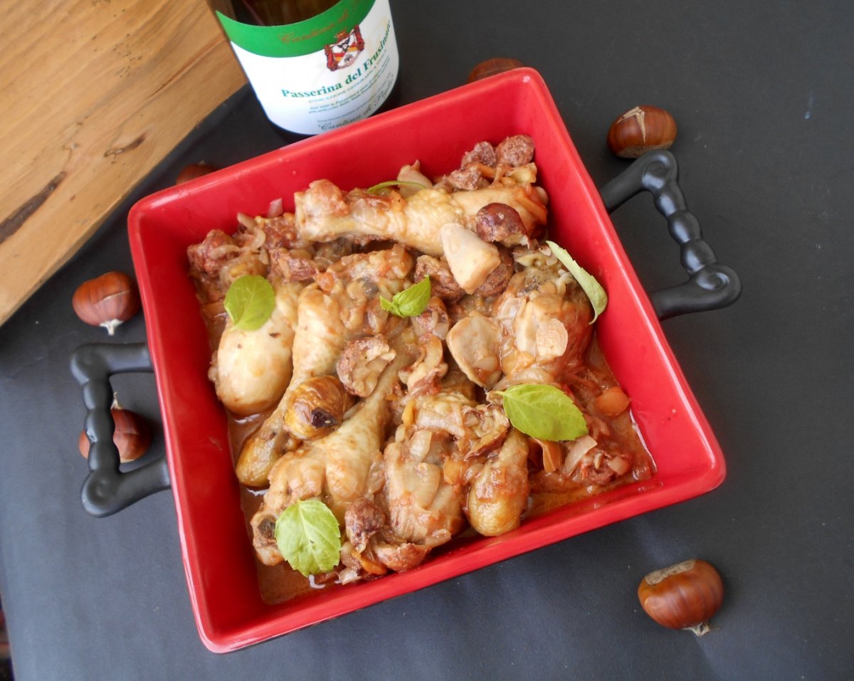 Acoperim cu un capac si in ultimele 10 minute de gatire am adaugat castanele coapte , decojite si taiate si rosia taiata cuburi .