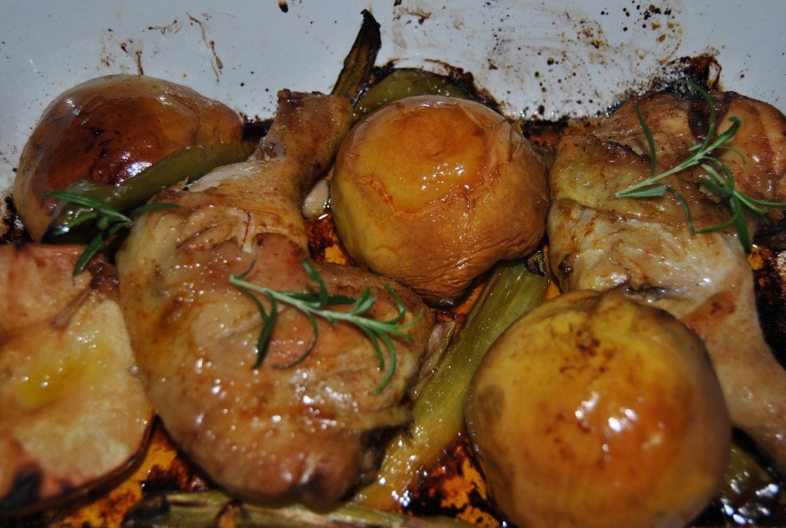 2) Pune carnea în formã de copt cu gutuile, stropeste cu ulei si dã la copt.
