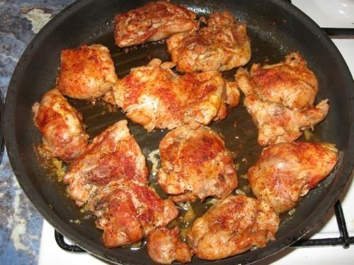 Intr-o tava de teflon ondulata, ca cea folosita pentru gratar, se pune ulei, se aseaza pulpele deja condimentate si se pun la prajit pe aragaz. Dupa cca 2-3 min, cand prind o culoare alba, pulpele se intorc pe partea cealalta pentru inca cca 3 min. Acum se pune cu o lingura peste pulpe cam jumatate din sosul de vin si usturoi, se pune un capac cu gauri, si se lasa la prajit, la foc mic, fara a se misca. Atunci cand sunt gata de prajit pe o parte, se intorc pulpele, si se pune sosul ramas, cu grija, peste fiecare pulpa. Daca este necesar, se mai adauga cate putina apa. La final, se toarna sosul rezultat intr-un bol, si se continua prajirea pulpelor inca circa 5 min, petru a fi mai crocante.