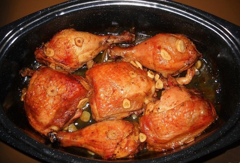 Dam tava la cuptorul preincalzit si lasam pana sosul din tava scade si pulpele se rumenesc frumos(aproximativ o ora).