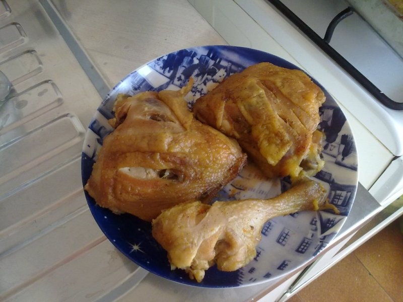 Cand este gata varsam continutul canutei peste pulpe, presaram putin piper alb, codimentele pentru pui,sarea si putin ulei dupa care punem un staniol deasupra tavii.