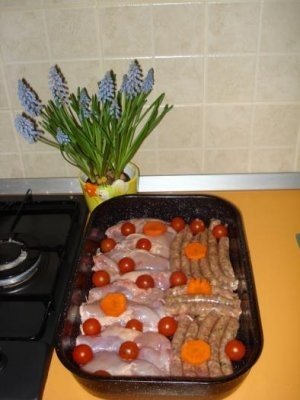 Toate ingredientele se pun in tava cu putina apa,ulei si condimente.