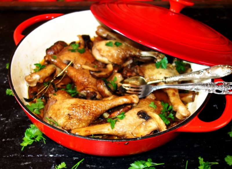 Dupa ce s-au rumenit pulpele de rata se adauga ciupercile, alaturi de usturoiul fin tocat, sare , piper proaspat macinat, boiaua dulce afumata, piperul Cayenne si cateva crengute de cimbru si se amesteca bine.