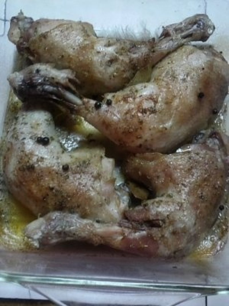 Fierbi pulpele in apa cu sare si legume. Cand sunt aproape fierte, le scoti din apa, le treci prin sosul obtiut din: ulei de masline, sare, piper, oregano, cimbru, chilli. Le asezi in vas de jena, adaugi foaia de dafin, sosul ramas si vinul. Dai la cuptor pana se rumenesc. Intorci pulpele sa se rumeneaca pe amblele parti.