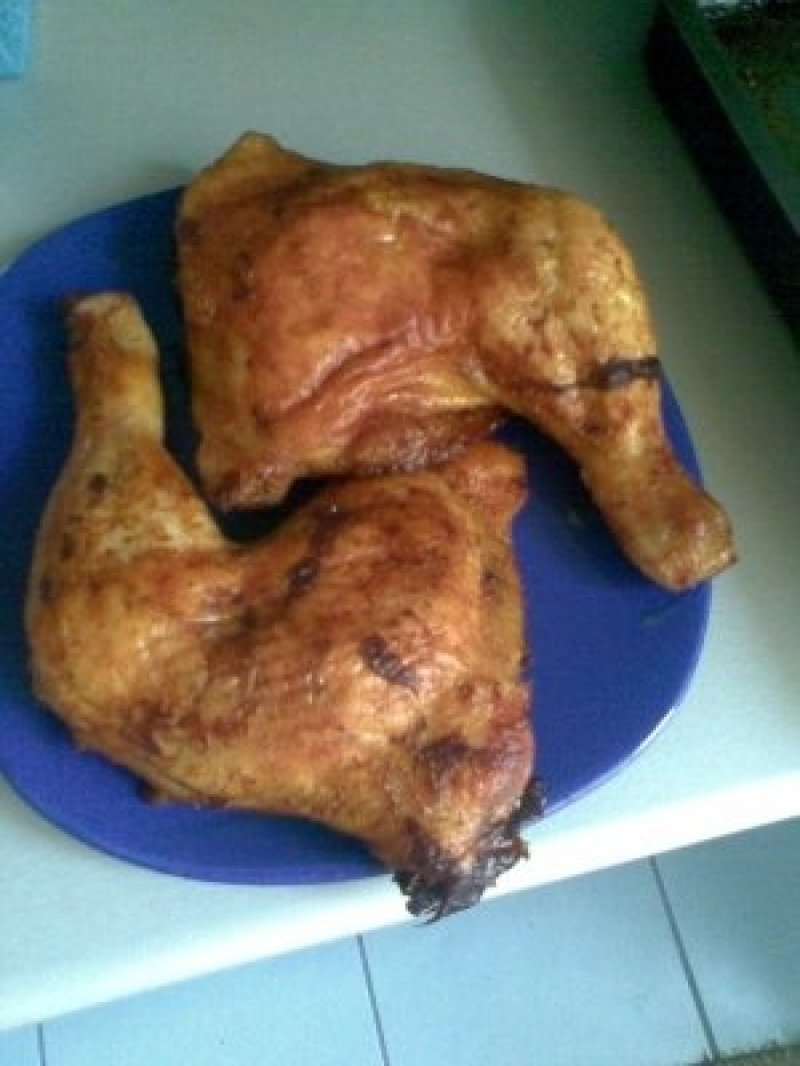 Pulpele se spala, se condimenteaza cu sare, delikat, piper, sau condiment pentru carne de pui, se aseaza intr-o tava cu putina apa si se dau la cuptor pentru 1 ora. Daca vedeti ca apa a scazut mai adaugati pe parcurs. In timpul coacerii mai stropiti pulpele cu apa din tava.