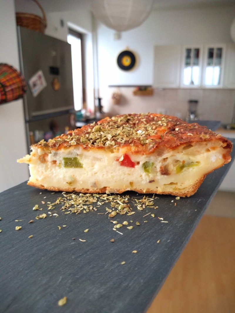 Separat, tăiaţi roşia, ardeiul şi ceapa. Fărâmiţaţi brânza. Adăugaţi-le pe toate, împreună cu sare, după gust, în amestecul deja format. Turnaţi într-o tavă rotundă (pe care aţi uns-o şi tapetat-o în prealabil; eu am folosit una de silicon şi nu a fost nevoie) şi introduceţi la cuptor pentru 35 minute. Presăraţi oregano deasupra.