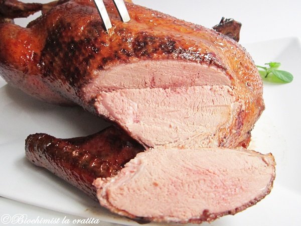 Daca o vreti mai bine facuta sau daca rata este mai mare, o mai lasati inca o ora in cuptor (la 190 grade C cu pieptul in jos si abia apoi o glazurati).