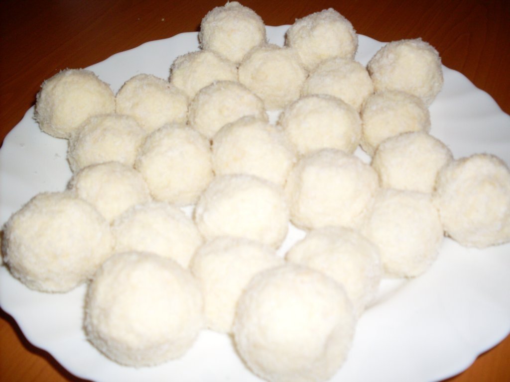 Se freaca cu o lingura de lemn zaharul, pachetul intreg de unt, laptele praf, 2-3 linguri nuca de cocos si untul topit pana devine un aluat dulce usor de modelat in palma dupa care se adauga foile de napolitane maruntite. Se amesteca din nou compozitia dupa care se tine o jumatate de ora la frigider. Se fac bilute de marimea unei nuci, iar in mijloc se pune cate o migdala sau o aluna de padure (depinde de gusturile fiecaruia). Se tavalesc prin nuca de cocos pana se acopera complet si se servesc dupa ce se mai tin 10 minute la frigider. Pofta buna!